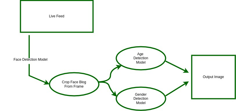 4- Age Detection Model (مدل تشخیص سن): چهره برش داده شده به مدل تشخیص سن منتقل میشود. این مدل با طبقهبندی افراد در محدودههای سنی خاص، سن آنها را پیشبینی میکند. این مدل از شبکههای از پیش آموزش دیده برای پیشبینی بر اساس ویژگیهای چهره استفاده میکند.